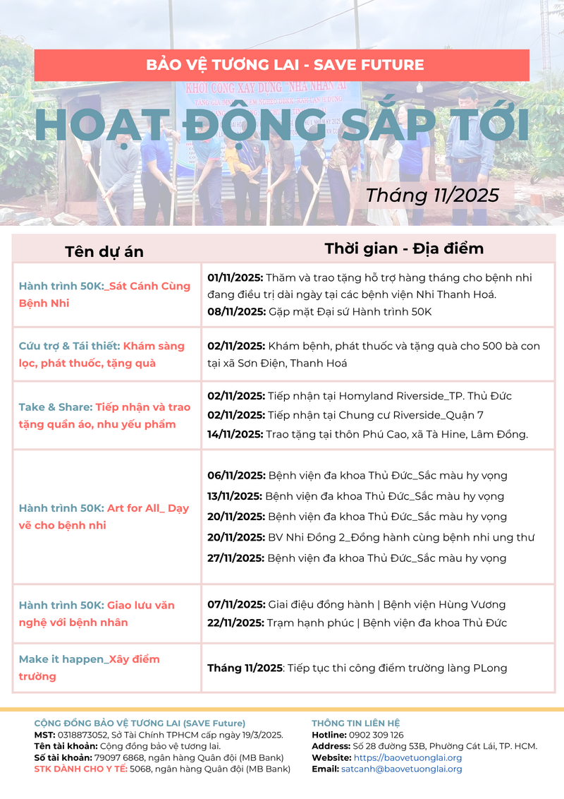 Tháng 11, SAVE Future sẽ tiếp tục giữ lửa hoạt động thiện nguyện định kỳ và tập trung nguồn lực vào các dự án trọng điểm sau: