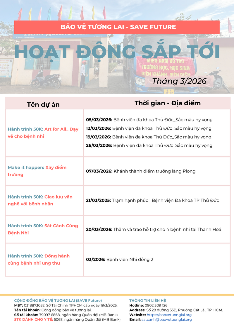 Khép lại tháng 2 với sự cân bằng hoàn hảo, SAVE Future đã sẵn sàng bước sang tháng 3 với những kế hoạch đầy hứa hẹn. Đáng chú ý nhất là sự kiện được mong đợi: Khánh thành điểm trường làng Plong dự kiến vào ngày 07/03/2026. Cùng với đó, chuỗi hoạt động nghệ thuật chữa lành và các chương trình hỗ trợ y tế vẫn s
