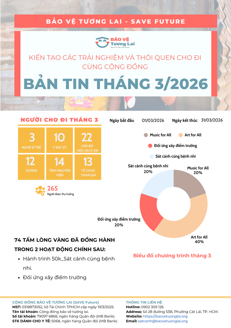 Trong tháng 3, các dự án của SAVE Future đã mang lại nụ cười và sự hỗ trợ trực tiếp cho 265 người thụ hưởng. Để làm được điều đó, chúng tôi xin gửi lời tri ân sâu sắc đến sự chung tay của: