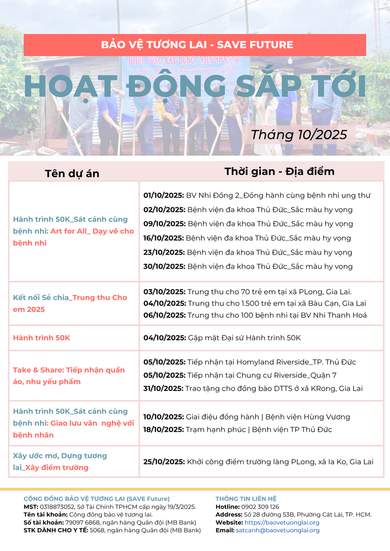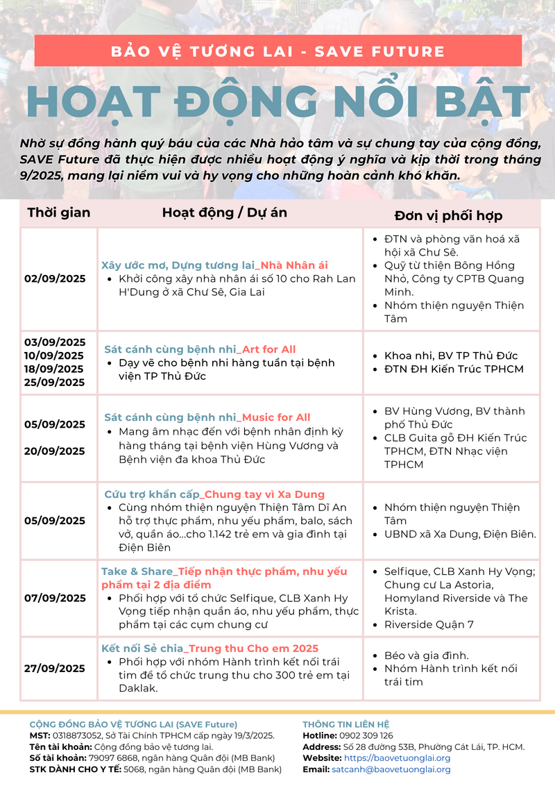 Tháng 10, SAVE Future sẽ tiếp tục với 16 hoạt động quan trọng. Chúng tôi cần sự đồng hành của bạn để tạo ra những khoảnh khắc đáng nhớ nhất: