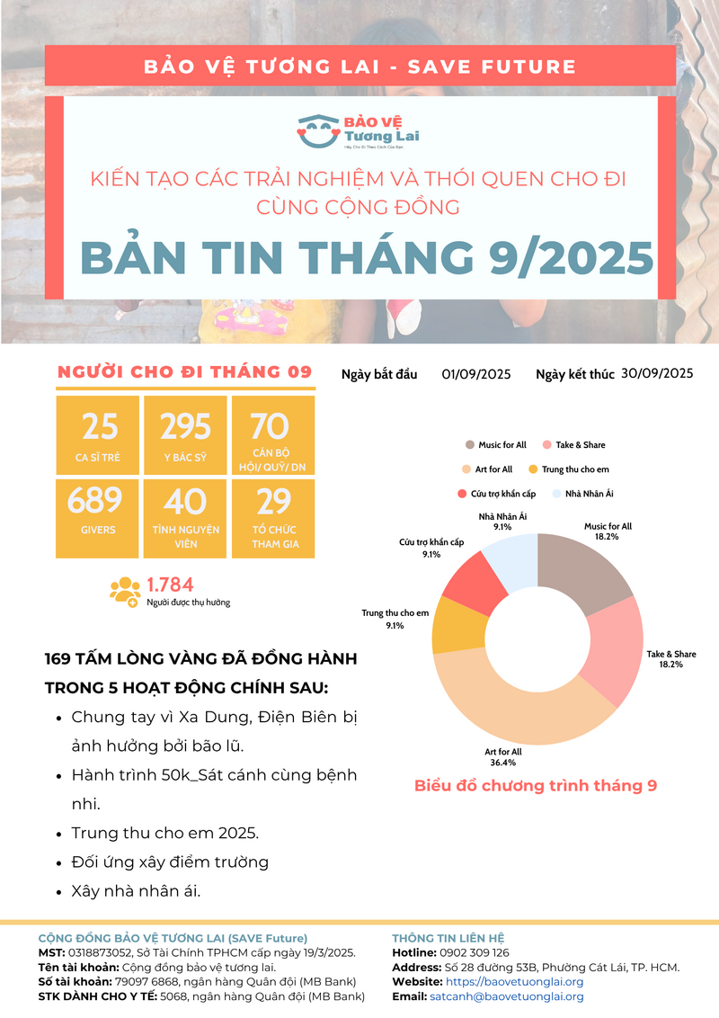 Xin tri ân sâu sắc tất cả các GIVERs đã tin tưởng, đồng hành và cho đi không ngừng trong suốt tháng 9! Chính tấm lòng của bạn là nguồn động lực lớn nhất để viết tiếp câu chuyện ước mơ của trẻ em có hoàn cảnh khó khăn khắp Việt Nam cùng SAVE Future.