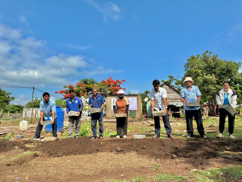 Kpa Tiệp và mẹ cùng với đại diện chính quyền địa phương đặt nền móng cho chính ngôi nhà của mình