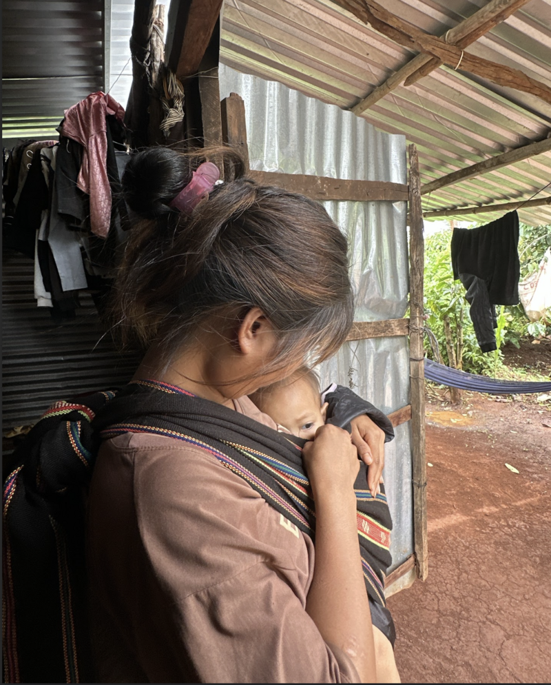Rah Lan H'Dung và mẹ bên căn nhà vách tôn và nền đất cũ